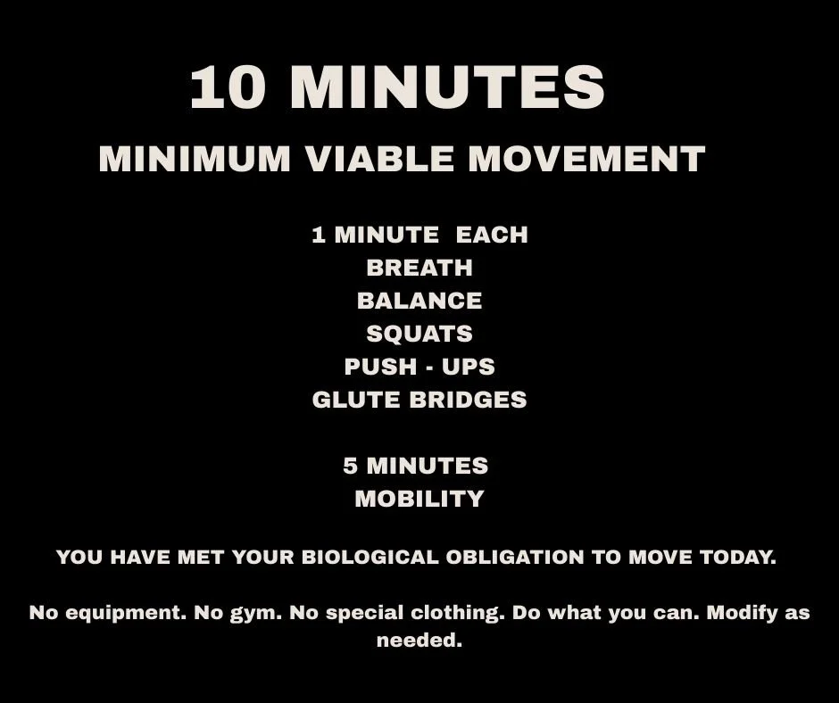 Ten minutes done regularly has a greater impact than sporadic intense workouts. This is a floor you can return to during busy seasons, illness, recovery or low energy— without guilt, shame or judgment.